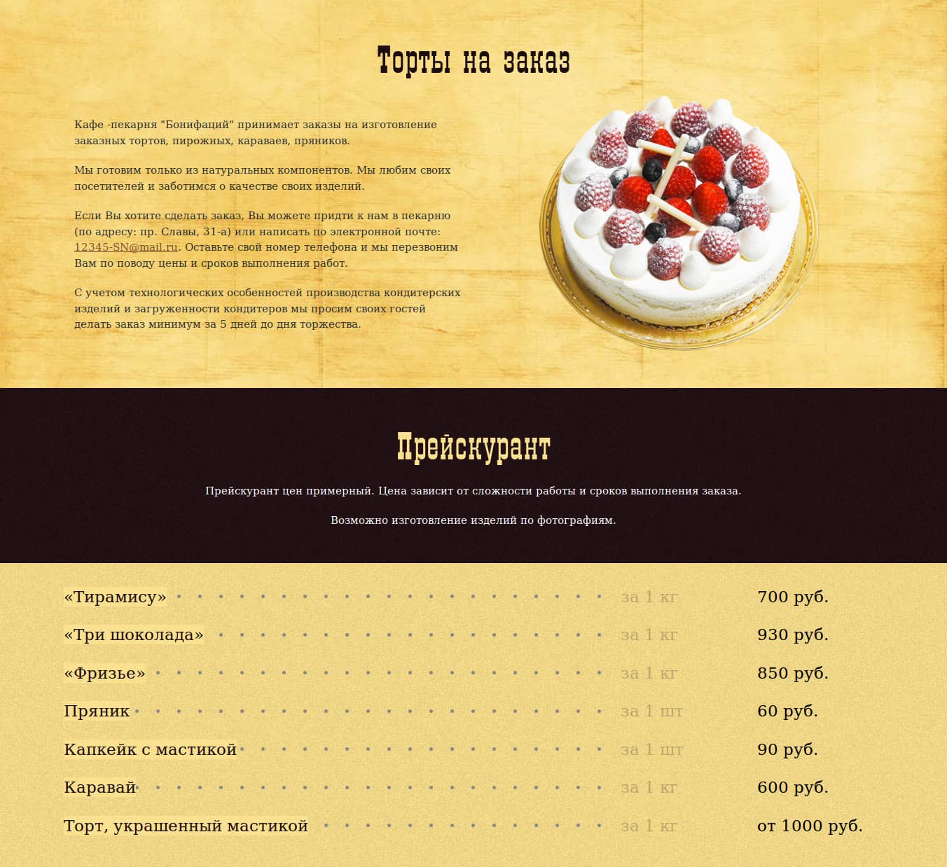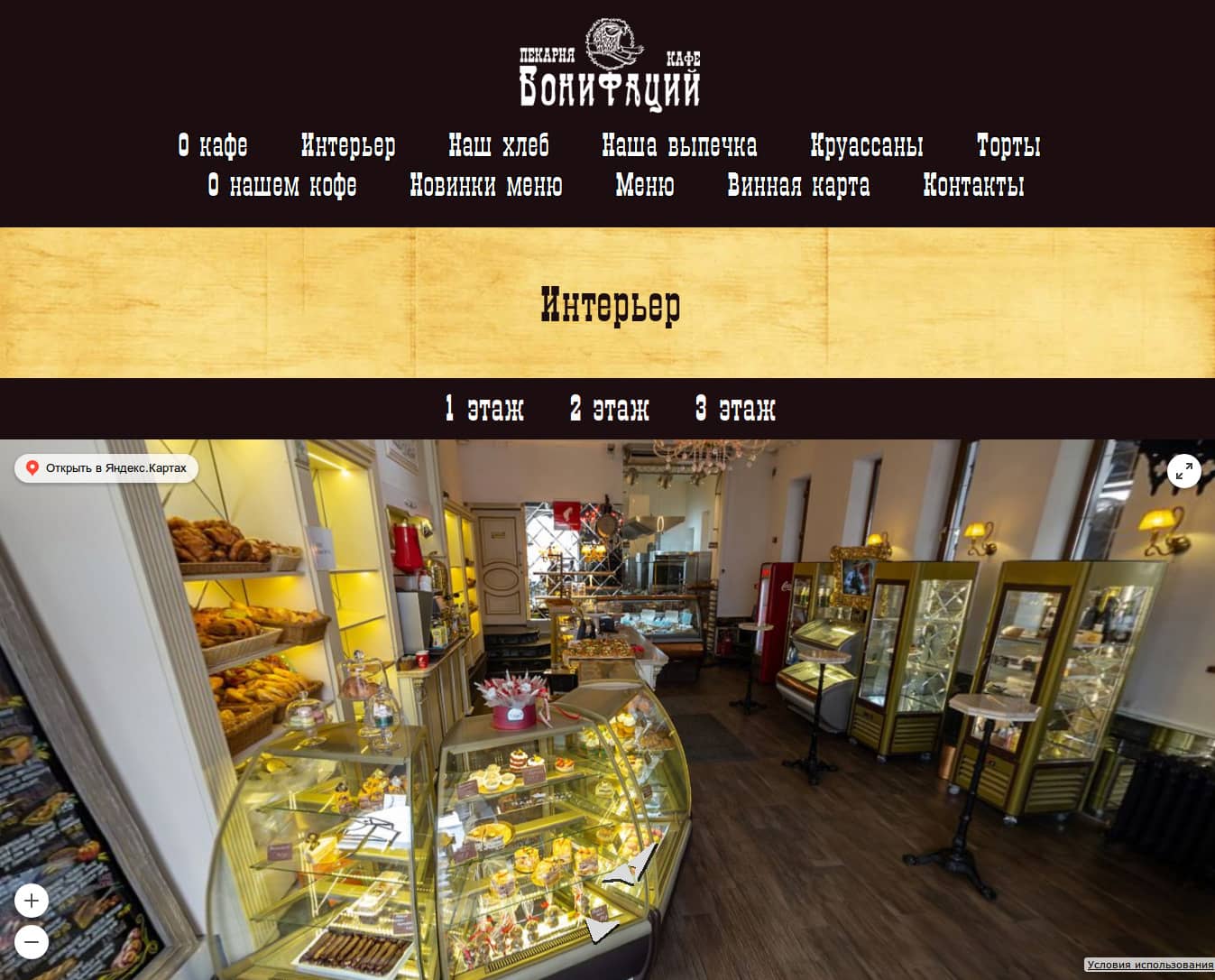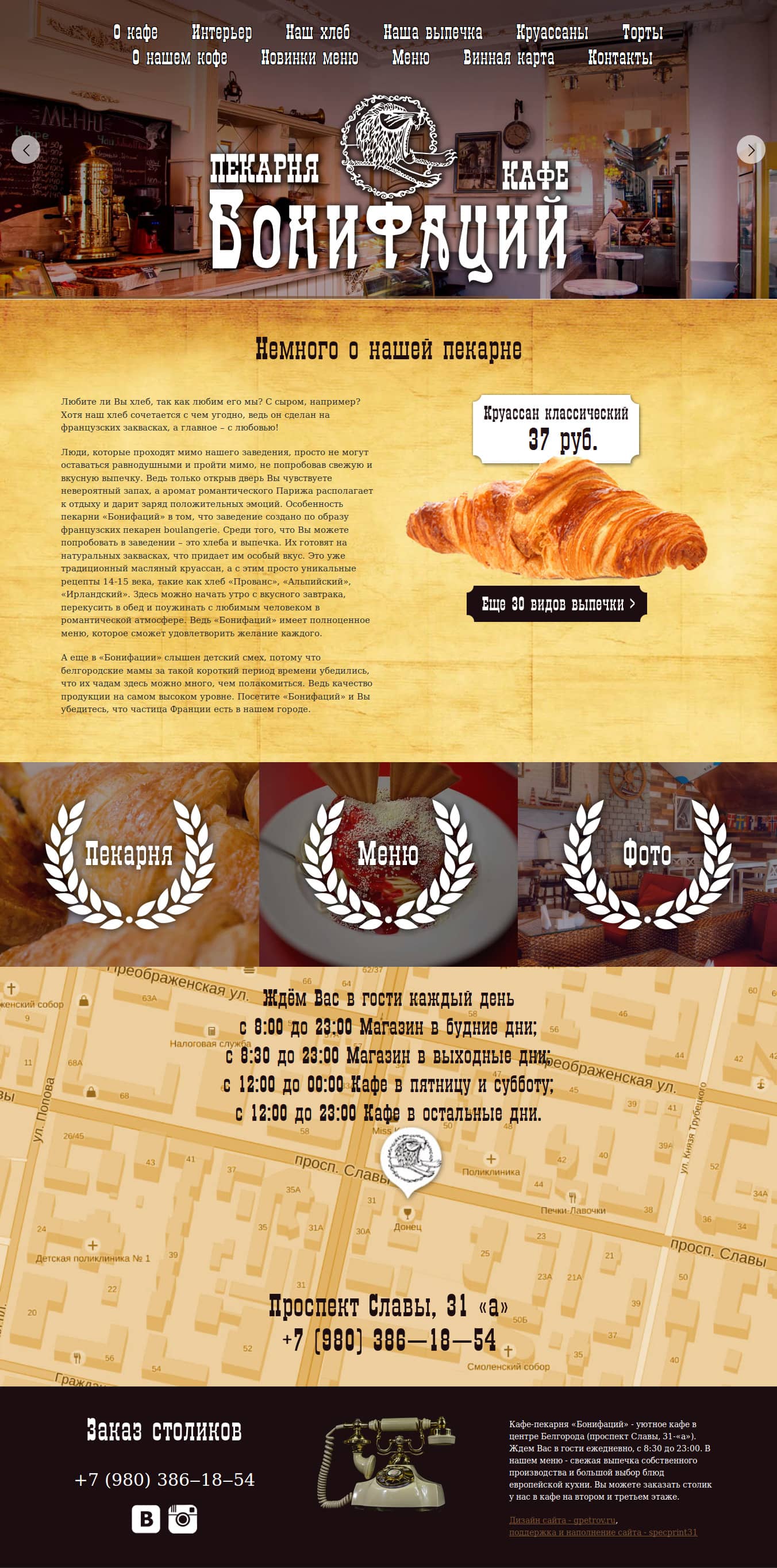 Свежая выпечка, шедевры европейской кухни и роскошный винтажный интерьер - вот что привлекает жителей нашего города в кафе-пекарню «Бонифаций». Для привлечения посетителей был создан имиджевый сайт кафе-пекарни с большим количеством фотографий, ассортиментом блюд и дизайном, воссоздающим атмосферу заведения.